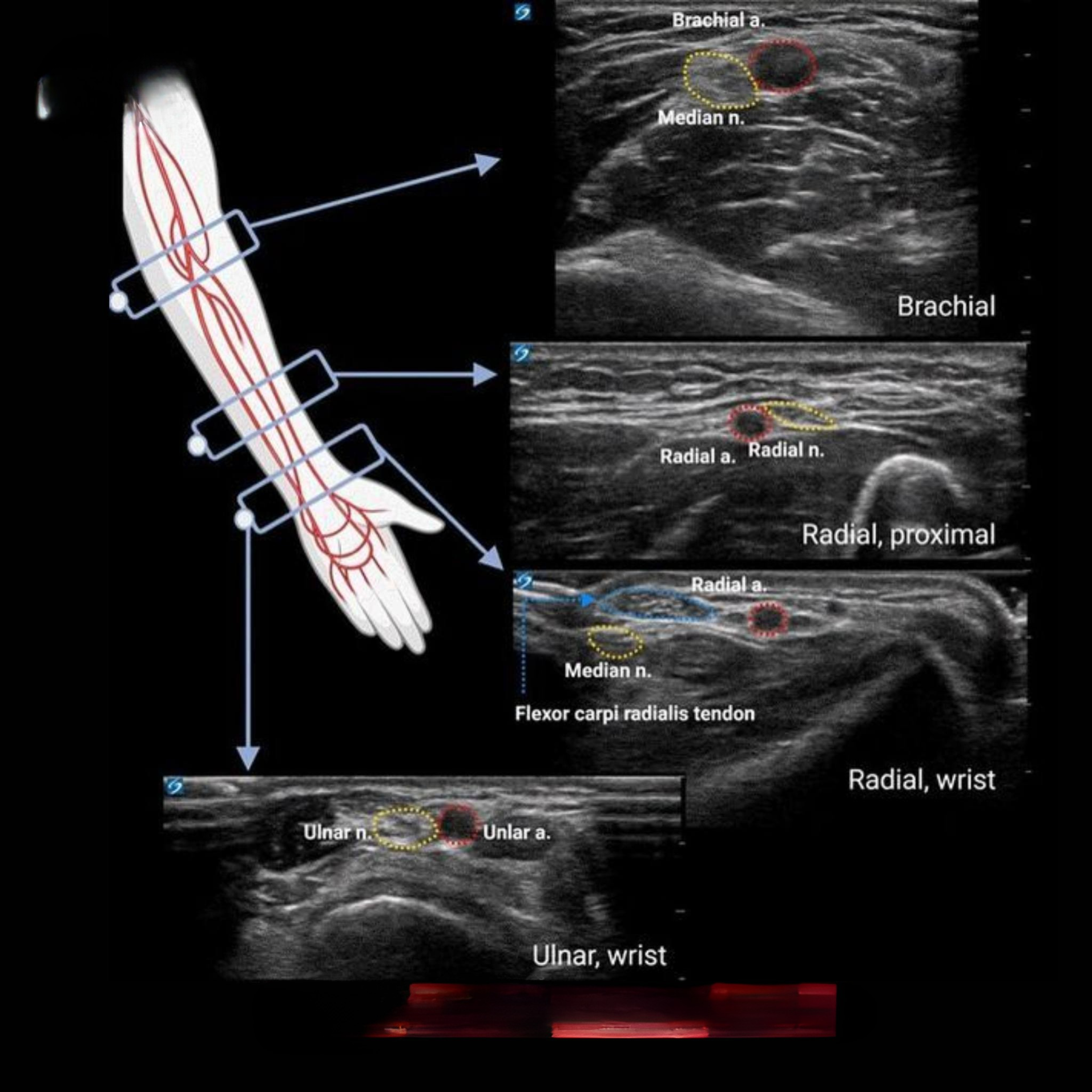 Giải phẫu siêu âm mạch máu chi trên tập trung vào việc hình ảnh hóa các động mạch và dây thần kinh lớn theo trục dọc từ trên xuống dưới. Hình ảnh minh họa thường chia cẳng tay thành các vùng chính: Brachial (cánh tay trên), Radial proximal (đầu gần xương quay), Radial wrist (cổ tay phía quay), và Ulnar wrist (cổ tay phía trụ). Mỗi lát cắt siêu âm trong giải phẫu siêu âm mạch máu sẽ khoanh vùng động mạch bằng màu đỏ – thường tròn, thành dày và đập theo nhịp tim – trong khi dây thần kinh được khoanh màu vàng với cấu trúc "tổ ong" không đập. Sự khác biệt này giúp phân biệt rõ ràng giữa mạch máu và thần kinh, hỗ trợ các bác sĩ trong chẩn đoán và can thiệp.