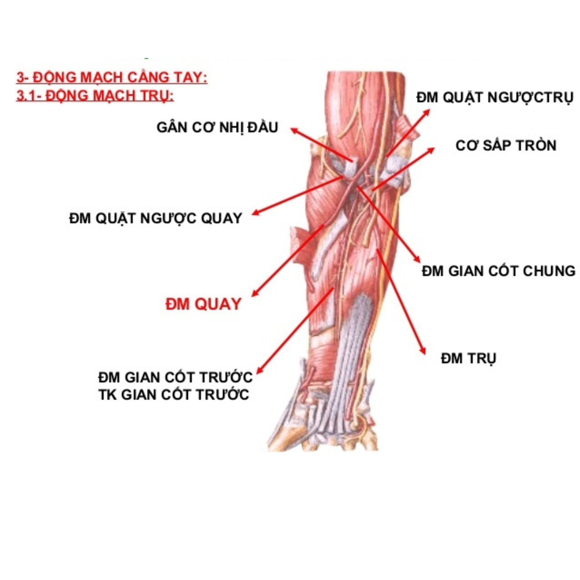 Chuyển xuống vùng đầu gần xương quay, giải phẫu siêu âm mạch máu tập trung vào Radial artery – động mạch quay dễ sờ và thường dùng để đo huyết áp động mạch liên tục (A-line). Trên hình ảnh siêu âm, động mạch này xuất hiện rõ nét với thành dày và dòng chảy pulsatile. Radial nerve nằm gần đó, nhưng ít được nhắm đến trong thủ thuật; tuy nhiên, trong đánh giá tổn thương, giải phẫu siêu âm mạch máu giúp phát hiện bất thường như huyết khối hoặc chèn ép.
