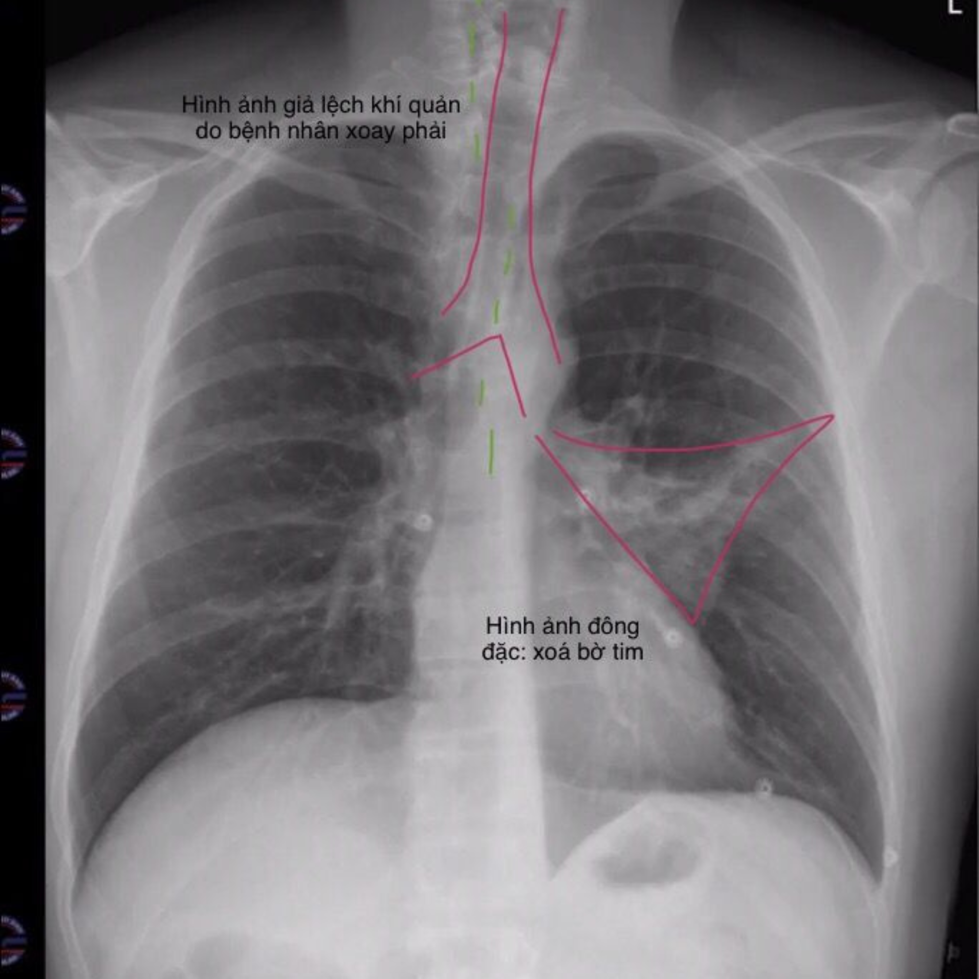 Tâm nhĩ trái (Left Atrium): Nằm phía sau tim, không tạo bờ rõ trên phim X-quang ngực thẳng. Tuy nhiên, khi tâm nhĩ trái lớn, nó có thể đẩy khí quản lệch phải hoặc chèn ép thực quản, là một dấu hiệu quan trọng trong giải phẫu trên X-quang ngực thẳng.