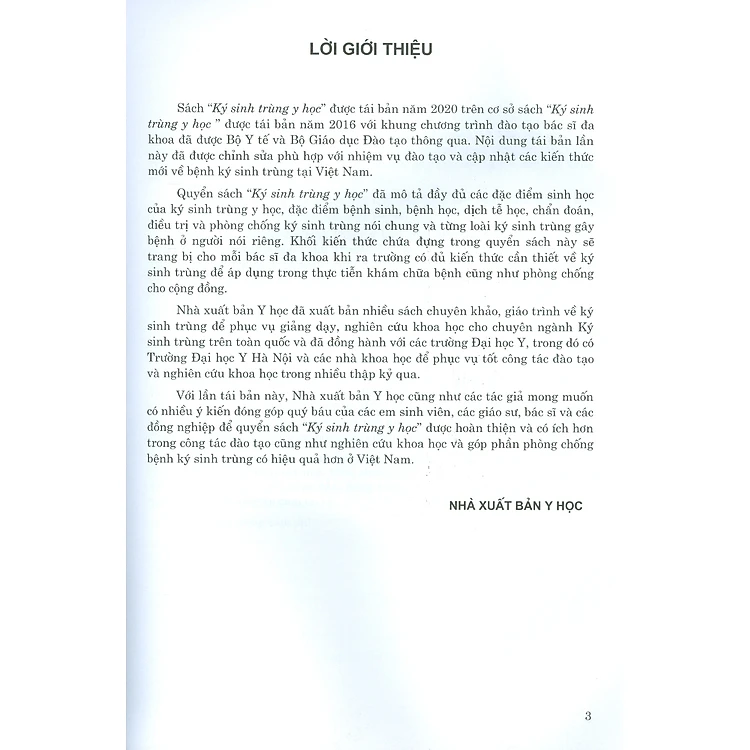 Cuốn giáo trình “Ký sinh trùng y học” này được tái bản dựa trên cơ sở cuốn “Ký sinh trùng y học ” của Trường Đại học Y Hà Nội năm 2016 đảm bảo khung chương trình và chương trình chi tiết đã được Bộ Y tế, Bộ Giáo dục & Đào tạo quy định cho các trường Đại học Y trong cả nước. Nội dung tái bản lần này có tham khảo và cập nhật các thành tựu nghiên cứu khoa học của chuyên ngành Ký sinh trùng trong toàn quốc.