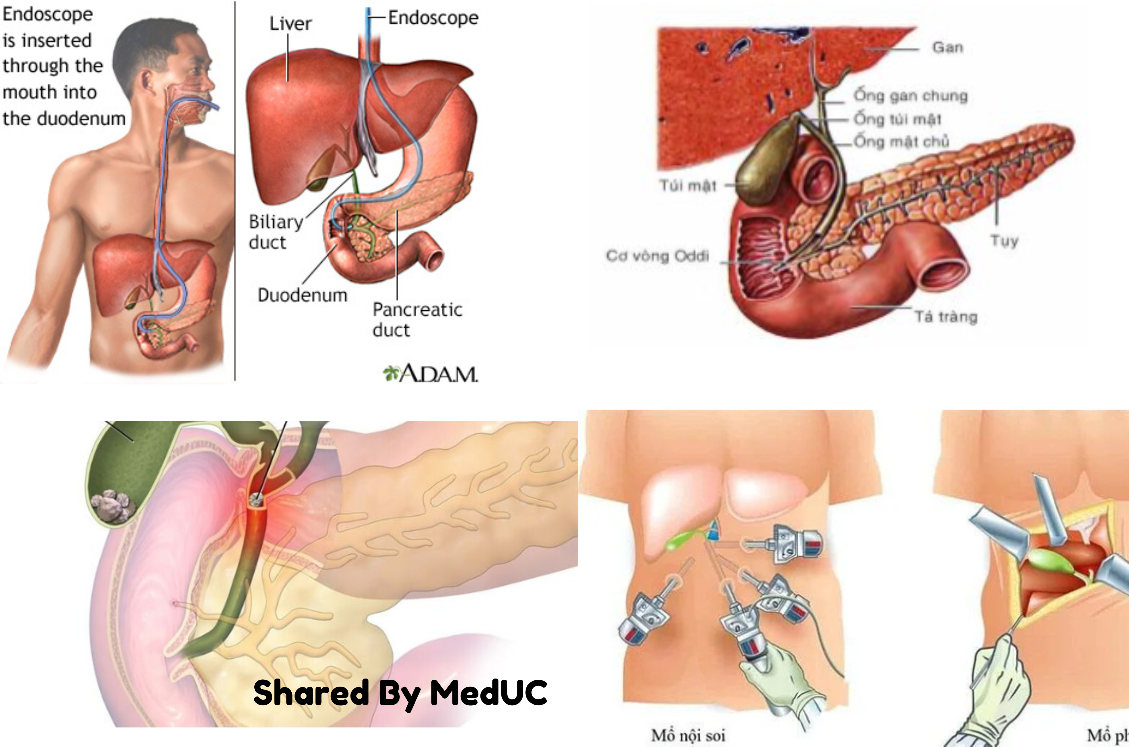 • Viêm đường mật do sỏi (cholangitis cấp): ERCP là lựa chọn điều trị đầu tay giúp dẫn lưu đường mật, lấy sỏi, và ngăn ngừa sốc nhiễm trùng.